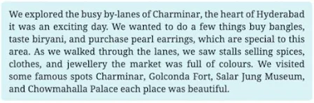 We explored the busy by-lanes of Charminar, the heart of Hyderabad; it was an exciting day. We wanted to do a few things: buy bangles, taste biryani, and purchase pearl earrings, which are special to this area. As we walked through the lanes, we saw stalls selling spices, clothes, and jewellery; the market was full of colours. We visited some famous spots: Charminar, Golconda Fort, Salar Jung Museum, and Chowmahalla Palace; each place was beautiful.